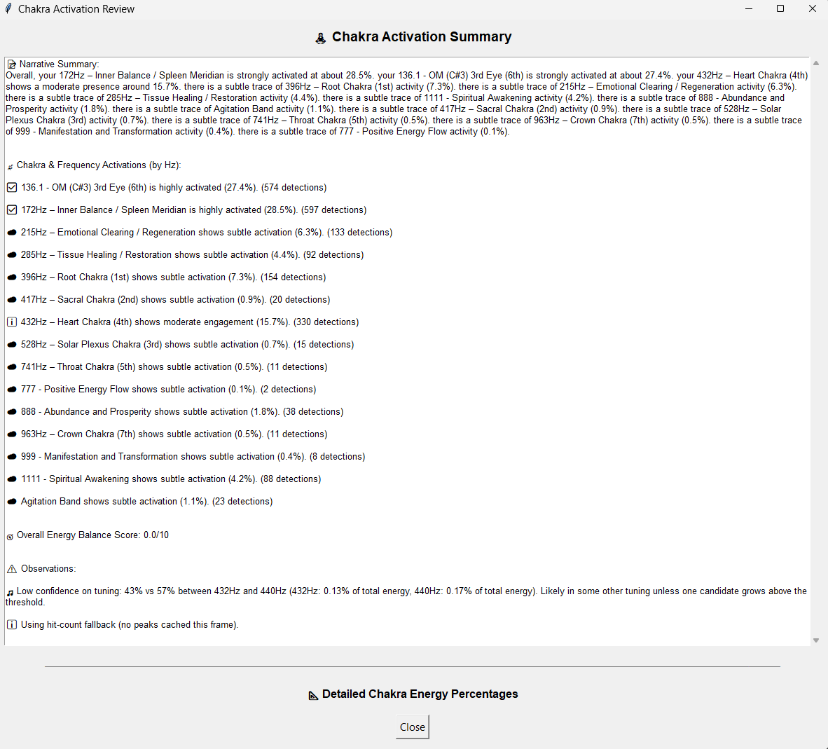 - Chakra "detection" is a heuristic mapping from frequency bands to traditional chakra concepts. It is speculative and culturally contextual.